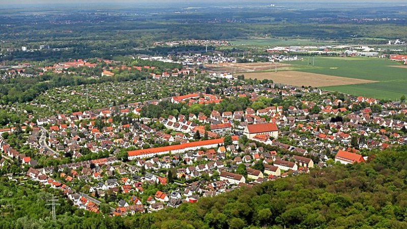 Die Südstadt von Südwesten aus gesehen in dieser aktuellen Luftaufnahme. Hier leben rund 2900 Einwohner. Im Vordergrund das Mascheroder Holz. Rechts oben Rautheim, oben links die Lindenbergsiedlung. Zwischen Südstadt und Lindenbergsiedlung sind deutlich die Kleingartenvereine Lindenberg zu erkennen.