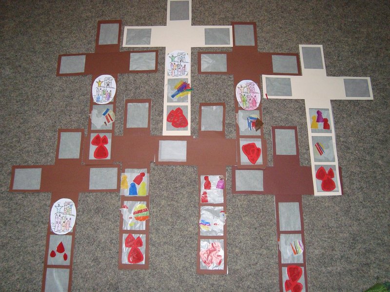 Der Kindergottesdienst der Markusgemeinde baut in der Passionszeit an einem großen Kreuz. Jede Woche kommen neue Symbole hinzu.