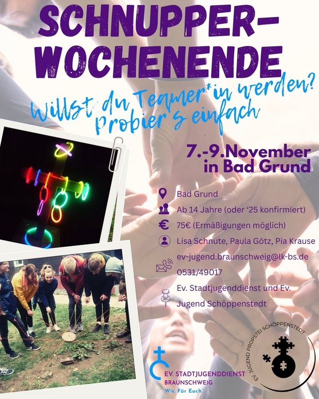 Die Evangelische Jugend Braunschweig lädt Jugendliche zu einem Schnupperwochenende ein. Angesprochen sind alle, die überlegen, Teamerin oder Teamer zu werden, sich aber noch unsicher fühlen oder noch zu jung für die Ausbildung zur JuLeiCa (Jugendleiter-Card) sind.